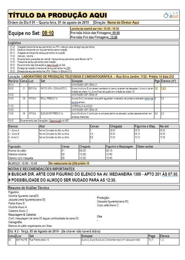 A Ordem do dia é um documento utilizado na produção Audiovisual como forma de organizar as agendas de todo o set de gravação, departamentos e suas equipes, é normalmente confeccionado pelo(a) Produtor(a) e é constantemente conferido e cobrado durante a diária.