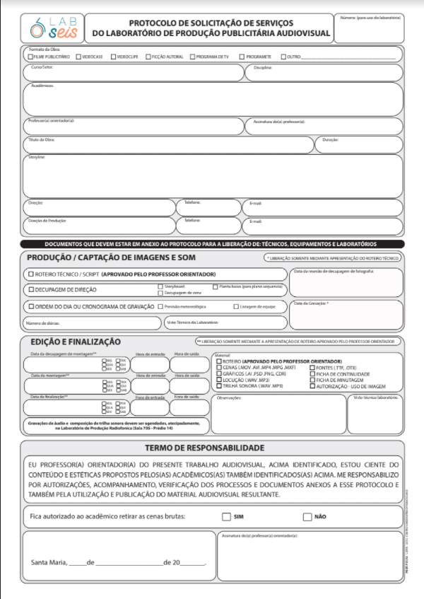 O protocolo de Solicitação de Serviços de Gravação e Edição é o documento que contém as informações onde o(a) acadêmico(a) e o professor orientador solicitam o serviço de gravação ou edição para o Labseis.