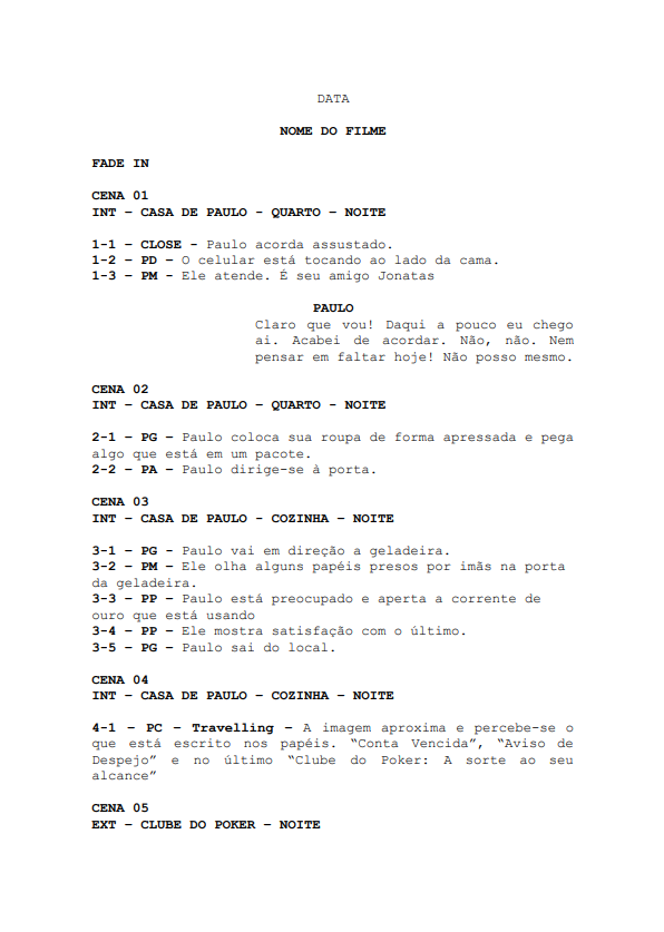 O roteiro Master Scene é o modelo utilizado na roteirização de cinema, trabalha com os principais elementos: Cabeçalho de Cena, Ação, Diálogos e Transições. A formatação é importante para esse modelo no correto dimensionamento do tempo de duração do audiovisual.
